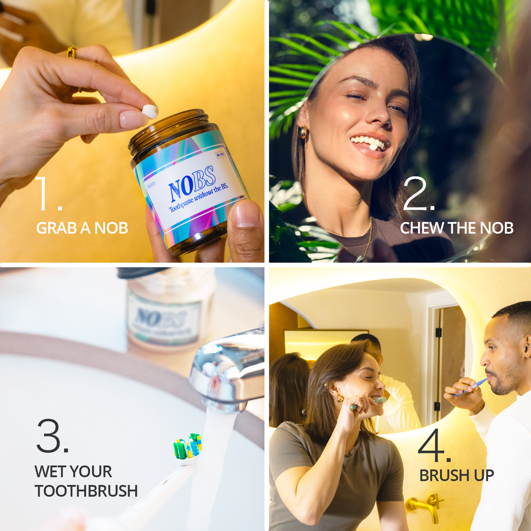 We house NoBS in a plastic-free glass jar - a little nod to our commitment to minimalist packaging. We aim to disrupt your brushing routine, not your endocrine system or the environment. If you've been looking for a no plastic toothpaste tablet option, you've found it! Our NoBS tablets are perfectly dosed for single use. No more squeezing tubes, and definitely no wasted toothpaste. They're also safe for children, making them a great choice for the entire family.